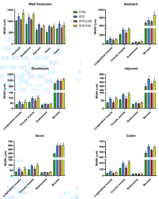 Considering the wall thickness as a whole, STZ segments showed an increase in the thickness compared to controls in the stomach (1216.28 ± 73.64 µm vs. 1023.89 ± 13.38 µm), duodenum (1178.89 ± 99.59 µm vs. 866.23 ± 69.34 µm), ileum (784.39 ± 26.65 µm vs. 515.19 ± 20.01 µm), and colon (900.13 ± 55.43 µm vs. 669.78 ± 47.06 µm), but not in the jejunum (859.42 ± 53.80 vs. 611.83 ± 83.16, p > 0.05). Treatment with losartan was only able to prevent this increase in the colon (724.27 ± 22.61 µm). Finerenone treatment did not have any effect on the walls’ thickness.