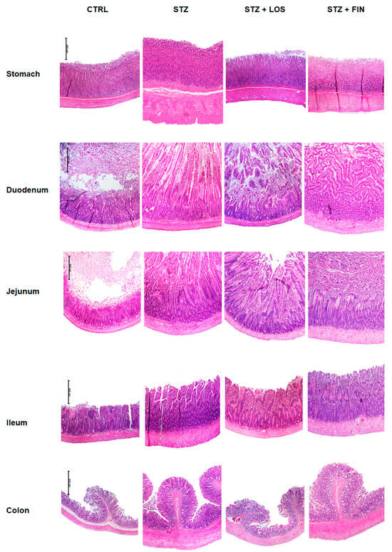 Representative microscopic photographs of stomach, duodenum, jejunum, ileum, and colon of control (CTRL), streptozotocin (STZ)- induced (STZ), STZ treated with losartan (STZ+LOS), and STZ treated with finerenone (STZ+FIN) stained with hematoxylin and eosin, captured using a 40× magnification. The scale bar (500 µm) shown in the first image of each row applies to all images in that row; n = 8 per group.
