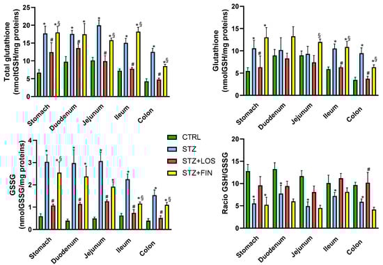 Glutathione evaluation of gastrointestinal segments (stomach, duodenum, jejunum, ileum and colon) of control rats (CTRL, n = 8), streptozotocin-induced diabetic rats (STZ, n = 8), streptozotocin-induced diabetic rats treated with losartan (STZ+LOS, n = 8) and streptozotocin-induced diabetic rats treated with finerenone (STZ+FIN, n = 8): total glutathione (tGSH) quantification (nmol tGSH/mg protein); glutathione (nmol GSH/mg protein), oxidized glutathione (GSSG) quantification (nmol GSSG/mg protein) and ratio GSH/GSSG. Values are mean ± SD. * Statistical difference (p < 0.05) to CTRL; # Statistical difference (p < 0.05) to STZ; § Statistical difference (p < 0.05) to STZ+LOS.