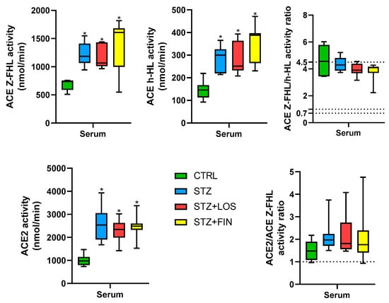 ACE2 activity was higher in the serum of all diabetic groups compared to controls (ACE2 activity in nmol/min, CTRL: 976.4 [733.9, 1469]; STZ: 2537 [1679, 3932]; STZ+LOS: 2345 [1422, 3019]; STZ+FIN: 2486 [1527, 3374], p < 0.05 for all). Also, the ACE2/ ACE Z-FHL activity ratio was greater than 1 in all experimental groups (Figure 7).