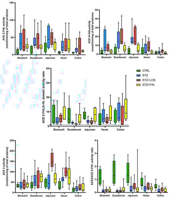 Looking at ACE h-HL activity, it was higher in the intestinal portions of the STZ and LOS-treated animals compared to the controls in the stomach (in nmol/min/mg of total proteins, STZ: 7.53 [3.58, 30.71] and STZ+LOS: 7.19 [2.97, 12.75] vs. CTRL: 0.86 [0.15, 4.8], p < 0.05), duodenum in nmol/min/mg of total proteins, STZ: 14.27 [2.60, 35.21] and STZ+LOS: 20.71 [11.52, 44.51] vs. CTRL: 2.03 [0.11, 11.15], p < 0.05), and jejunum (in nmol/min/mg of total proteins, STZ: 13.87 [11.55, 39.64] and STZ+LOS: 19.47 [10.56, 31.78] vs. CTRL: 3.63 [0.24, 8.59], p < 0.05).