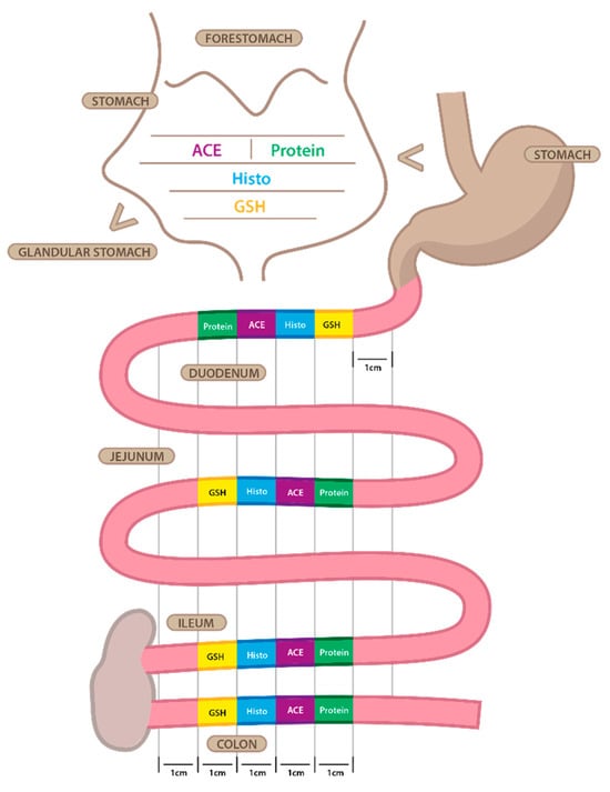 Representative illustration of the localization of the different portions of stomach, duodenum, jejunum, ileum, colon, and removed in order to perform total glutathione and oxidized glutathione quantification (GSH), histopathology (histo), angiotensin converting enzyme (ACE) and ACE2 activity (ACE) and protein quantification (protein).