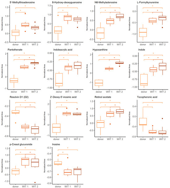 Change in levels of the selected metabolites during warm ischemia. Boxplots display normalized peak areas for both positive- and negative-mode analyzes. The rectangle’s height represents the normalized peak areas in the interquartile range (Q1 and Q3). Upper whisker—the largest data point excluding any outliers. Lower whisker—the lowest data point excluding any outliers. The median normalized peak area of each group is indicated with a square. Dots as observations >1.5 IQR (interquartile range) from the rectangle. Color legend: orange—donor, light red—WIT 1, dark red—WIT 2. The asterisk represents significant difference between the groups (p < 0.05).