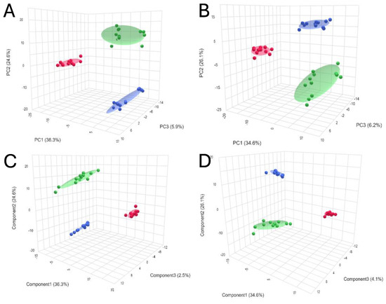 3D score plots of PCA and PLS-DA showing separation between different types of kidney preservation in positive ((A)—PCA; (C)—PLS-DA) and negative ((B)—PCA; (D)—PLS-DA) ionization modes. Color legend: HMP—red; NEVKP—green; SCS—blue.