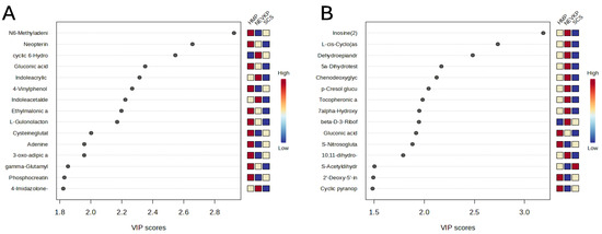 The VIP plot of the top 15 metabolites differentiating HMP, NEVKP and SCS during the preservation of kidney grafts. Results for positive (A) and negative (B) ionization modes.