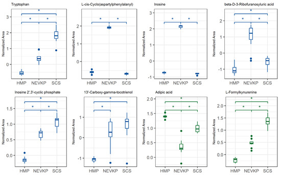 Differences in levels of the selected metabolites (FDR-adjusted p-value < 0.05) between three types of kidney preservation. Boxplots display normalized peak areas for both positive (green)- and negative (blue)- mode analyzes. The rectangle’s height represents the normalized peak areas in the interquartile range (Q1 and Q3). Upper whisker—the largest data point excluding any outliers. Lower whisker—the lowest data point excluding any outliers. The median normalized peak area of each group is indicated with a horizontal line. The asterisk represents significant difference between the groups (p < 0.05).