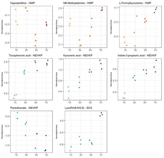 The most statistically significant (p < 0.05 after FDR correction) changes over time detected in the negative ionization mode were observed for HMP, and significantly fewer for NEVKP and SCS. In the case of positive ionization, there were fewer metabolites changing over time, but similarly to negative ionization, the most was observed for HMP, and fewer for normothermic and SCS conditions. The number of compounds showed a linear trend, particularly for the mechanic perfusions. Strip plots of selected compounds that demonstrated significant alterations during preservation are shown in Figure 5, and detailed information about the correlation coefficient and raw p-value are shown in Table S1.
