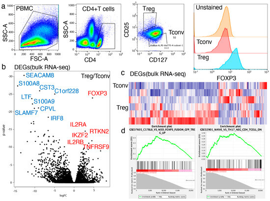 Tregs and Tconvs isolated from frozen PBMCs (n = 3, healthy donors) were characterized and sorted using FACS (Figure 1a). The analysis showed that the expressions of FOXP3, CD25, and CD127 differed significantly between Treg and Tconv populations but were homogeneous among the three independent PBMC donors used in this study (Supplementary Figure S1). RNA-seq analysis demonstrated that Tregs maintained a unique gene expression profile compared with the Tconvs isolated from the same PBMC donors (Figure 1b). Based on conventional RNA-seq analysis, 1004 differentially expressed genes (DEGs) were identified between Tconvs and Tregs isolated from the same PBMC donors (Figure 1c). As expected, FOXP3 expression was significantly higher in Tregs than in Tconvs (p = 4.73 × 10−159). In addition, known Treg-related molecules, including IL2RA (p = 2.58 × 10−60), RTKN2 (p = 6.52 × 10−50), IKZF-2 (p = 6.23 × 10−43), TNFRSF9 (p = 5.57 × 10−42), and IL2RB (p = 3.98 × 10−36) were significantly enriched in Tregs compared with Tconvs. Gene set enrichment analysis (GSEA) was used to confirm the Treg-related gene signatures in Tregs in comparison with Tconvs (Figure 1d, Supplementary Figure S2). The data confirmed that Tregs have a unique gene expression profile compared with that of Tconvs.