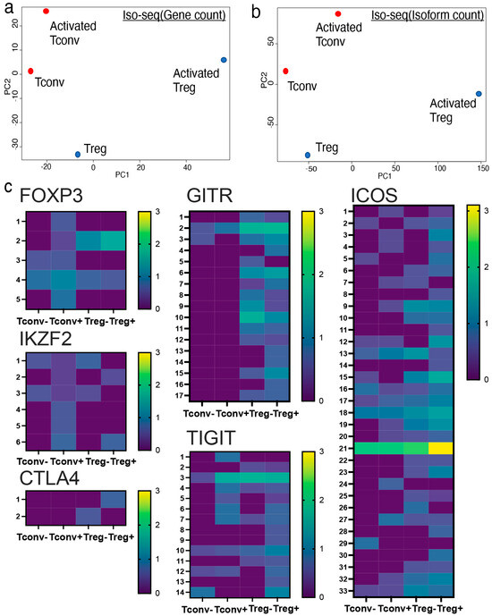 Figure 2. Iso-seq identified Treg-specific isoform usage upon activation. Isoform expression profiles of activated Tregs were analyzed by Iso-seq. (a,b) Principal component analysis (PCA) plot of Iso-seq shown by (a) total gene counts and (b) total isoform counts. (c) Isoform expression of Treg-related genes including FOXP3 (2 = full length, 4 = delta 2 isoform), IKZF-2 (3 = full length), CTLA-4 (2 = full length), GITR (2 = full length), TIGIT (3 = full length), and ICOS (21 = full length) shown by heatmap (log10TPM).