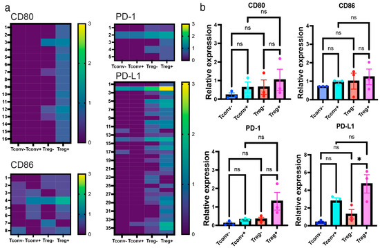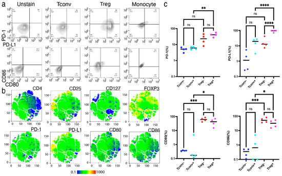 CD80 and CD86 are expressed by activated CD4+ T cells with CD80 contributing to the stabilization of FOXP3 expression [23]. Our previous RNA-seq analysis identified significant upregulation of CD80 in freshly isolated Tregs compared to that in Tconvs [24]. Tregs have also been shown to express CD80 and CD86; however, the function of these molecules on Tregs has not been fully disclosed [25]. Our findings do not contradict a previous description that the upregulation of CD80 and CD86 occurred with PD-L1 upregulation. Traditionally, CD80, CD86, and PD-L1 were considered surface molecules preferentially expressed by antigen-presenting cells, rather than T cells. However, they are now known to be expressed by Tregs upon activation [26]. This indicated that Tregs express common antigen-presenting cell molecules upon activation. These surface molecules are ligands for PD-1 and CTLA-4; therefore, they might be associated with Treg–Treg interactions or other forms of intercellular communication among immune cells.