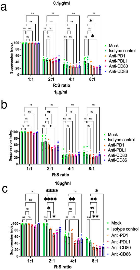 According to the Iso-seq analysis, it is hypothesized that PD-L1 contributes to the stabilization of FOXP3 and its suppressive function in human Tregs. To investigate the importance of PD-L1 expression on Tregs, FOXP3 expression and suppressive function were assessed after antibody blocking of surface molecules, including PD-1, PD-L1, CD80, and CD86. Antibody blocking did not diminish FOXP3 expression on Tregs (Supplementary Figure S5). It was not possible to observe a significant difference at the PD-L1 antibody concentration of 0.1 μg/mL across the different ratios of Tregs versus Tconvs (Figure 6a). Interestingly, inhibition of PD-L1 on Tregs resulted in the loss of suppressive function at a PD-L1 antibody concentration of 1.0 (p < 0.01)–10 μg/mL (p < 0.05), especially when Tregs were co-cultured at a 1:1 or 2:1 ratio together with Tconvs. This is in contrast to the effect noted in the isotype control (Figure 6b,c). In contrast, PD-1, CD80, and CD86 antibody inhibition of Tregs neither enhanced nor diminished suppressive function among different antibody concentrations (Figure 6a–c). Collectively, these findings indicate that PD-L1 expression on activated Tregs is important for the maintenance of FOXP3 expression and its suppressive function.