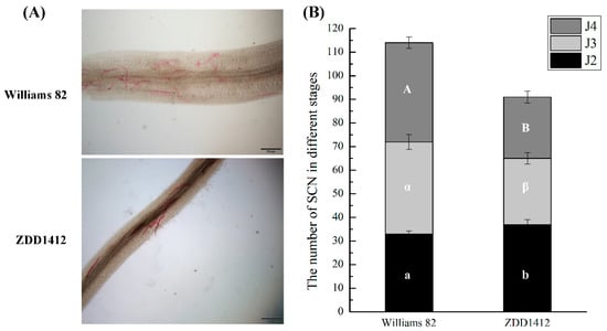 Soybean cyst nematode (SCN) in soybean roots. (A) Microscopic observation of SCN enrichment staining in root systems of different resistant soybean varieties. Scale bars: 500 μm. (B) Number of SCNs at different developmental stages in soybean roots. Different letters indicate significant differences: a or b for J2, α or β for J3, A or B for J4.