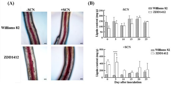 The root cell wall serves as the first physical barrier against SCN invasion, with lignin being a crucial component of the cell wall. The lignin staining of SCN-infected soybean roots showed that, 10 days post-inoculation, the ZDD1412 roots had a substantial accumulation of lignin, whereas the lignin content in the Williams 82 roots remained largely unchanged before and after SCN inoculation (Figure 2A). Additional measurements of the lignin content across different lines revealed no significant difference between the Williams 82 and ZDD1412 plants under non-inoculated conditions. However, following SCN inoculation, the lignin content in the ZDD1412 roots was significantly higher than that in the Williams 82 (Figure 2B) roots. The results suggest that, under SCN stress, the ZDD1412 variety can enhance lignin synthesis to combat the stress, whereas the Williams 82 variety can only synthesize a small amount of lignin, showing greater sensitivity to SCN.