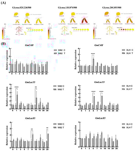 Expression changes oflignin signaling genes under SCN stress. (A) Predicted gene expression of lignin signaling genes GmC4H (Glyma.02G236500), GmLac55 (Glyma.13G076900), and GmLac85 (Glyma.20G051900). (B) Relative expression levels of GmC4H, GmLac55, and GmLac85 in roots at various day post-SCN inoculation. Asterisks indicate statistical significance: ** p < 0.01, **** p < 0.0001. Data represent three biological replicates.