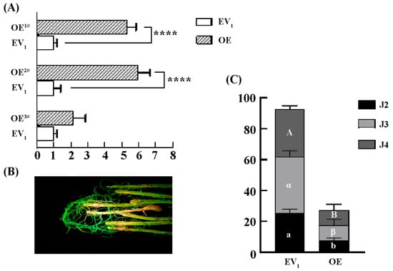 Overexpression of GmLac55 enhances soybean root resistance to SCNs. (A) Relative expression levels of GmLac55 in overexpressed groups (OE, n = 5) and empty vector control groups (EV1, n = 3). Asterisks indicate statistical significance: **** p < 0.0001. (B) Fluorescent hairy roots (OE) can be easily distinguished using the LUYOR-3415RG as the excitation light source. (C) Total number of SCNs in soybean roots and demographic assays of SCNs at different stages between overexpressed groups (OE, n = 5) and empty vector control groups (EV1, n = 5) (one-way ANOVA; in EV1 versus OE, a or b indicates significant differences for J2, α or β for J3, A or B for J4).