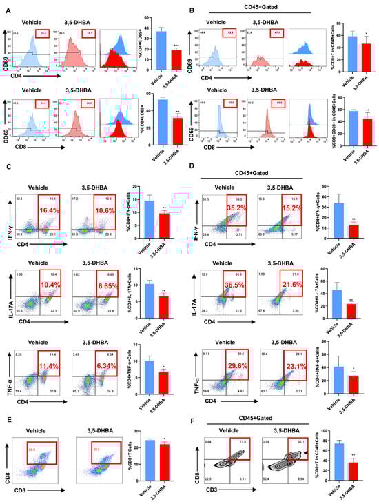 Con A-induced AIH is primarily driven by T lymphocyte activation, leading to acute liver injury. To investigate if GPR81 activation inhibits T cell activation, we collected liver and spleen tissues from the vehicle and 3,5-DHBA groups and then prepared single-cell suspensions for flow cytometry. The activation of T cells was assessed by measuring CD4+CD69 and CD8+CD69 markers. In both tissues, 3,5-DHBA significantly reduced the percentage of activated CD4+ and CD8+ T cells (Figure 2A,B). We also examined the expression of CD4+IFN-γ, CD4+IL-17A, and CD4+TNF-α in the liver and spleen, observing a marked decrease in the 3,5-DHBA group (Figure 2C,D). Additionally, GPR81 activation reduced CTL expression in both organs (Figure 2E,F). These results suggest that pharmacological activation of GPR81 suppresses T cell activation in mice.