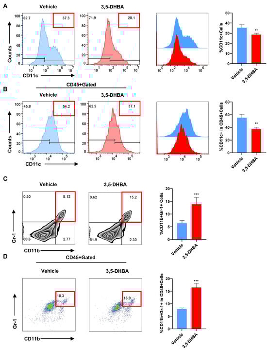 Previous experiments have confirmed the effect of GPR81 activation on T cells in AIH development. To further explore its impact on other immune cells, we assessed CD11c+ expression in the liver and spleen. Flow cytometry showed a significant decrease in CD11c+ expression in the 3,5-DHBA group, especially in the liver (Figure 3A,B). We also examined CD11b+Gr-1+ expression, which represents MDSC frequency. Flow data revealed an increase in double-positive cells in the 3,5-DHBA group (Figure 3C,D), indicating a potential role in the immune regulation of hepatitis. These results suggest that GPR81 activation affects T cell activation, reduces DC secretion, and promotes MDSC accumulation in Con A-induced hepatitis.