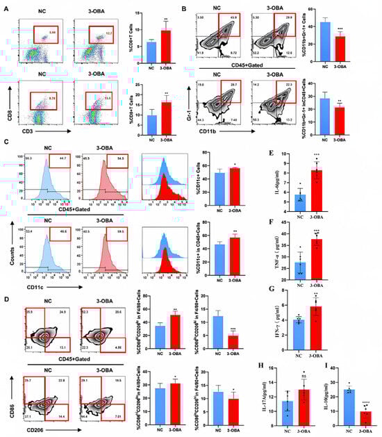 In vivo remodeling of the tumor immune microenvironment (TIME) and anti-tumor immune response induced by 3-OBA. Twenty-one days after orthotopic HCC implantation, tumor and spleen mononuclear cells were harvested and stained. Flow cytometry was applied to analyze the expressions of CTL (CD3+CD8+) (A), MDSCs (CD11b+Gr-1+) (B), DCs (CD11c+) (C), F4/80+CD86hiCD206low M1, and F4/80+CD86lowCD206hi M2 (D). Flow cytometry was used to detect cytokines in tumor tissues, including IL-6 (E), TNF-α (F), IFN-γ (G), IL-17A (H), and IL-10 (I). Data are presented as the mean ± SD. * p < 0.05, ** p < 0.01, *** p < 0.001 and **** p <0.0001. (Student’s t-test, n = 6 mice per group).