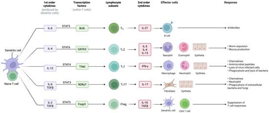 Accumulating evidence shows that each Th cell type and related second-order cytokines play different roles at the cellular and tissue levels, eliciting specific responses [], as shown in Figure 1.