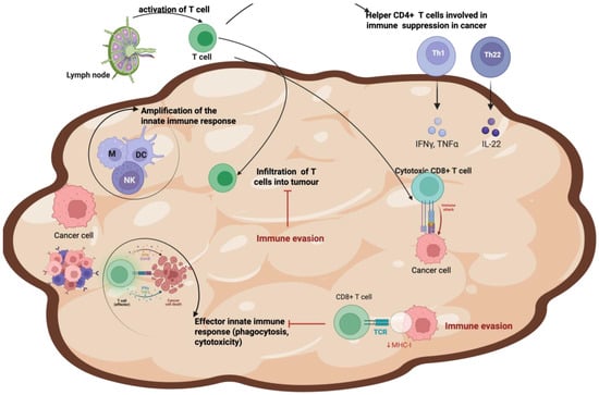 Immune surveillance and evasion mechanisms within the tumor microenvironment. This figure illustrates key steps in the immune defence response against tumor cells within the tumor. T cells primed in the lymph node infiltrate the tumor, where they interact with antigen-presenting cells such as macrophages (M), dendritic cells (DC), and natural killer (NK) cells, amplifying the innate immune response. Effector CD4+ and CD8+ T cells, including the Th1 and Th22 subsets, mediate anti-tumor functions through cytokines (e.g., IFN-γ, TNF-α, and IL-22) and direct cytotoxicity. However, tumor cells can evade immune attack by downregulating MHC-I, inducing T cell exhaustion, or modulating cytokine signalling.