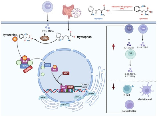 The activation of tryptophan metabolism is considered to be one of the main events in the AhR-mediated immune response due to the ability of tryptophan metabolites, such as kynurenines, to act as ligands for AhR. The liver and peripheral lymphocytes sustain tryptophan metabolism through the production of indoleamine 2,3-dioxygenase (IDO1) (Figure 5).