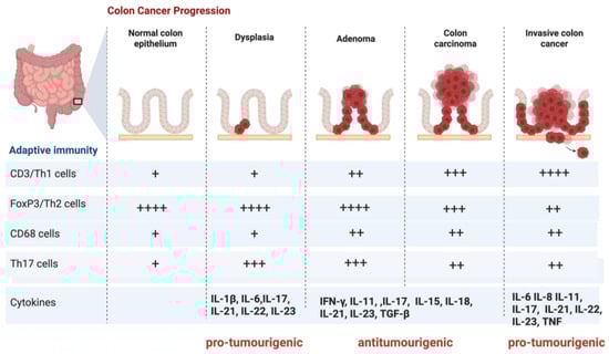 Immune modulation/adaptation across the progressive stages of colon carcinogenesis. This figure illustrates the dynamic evolution of adaptive immune responses during colon cancer development, from normal colon epithelium to invasive carcinoma. The ‘+’ symbols indicate the relative increase in the prevalence or functional influence of specific immune subsets or cytokine profiles at each stage. In the early phases (normal epithelium and dysplasia), the immune microenvironment shows a pro-tumorigenic profile that supports initial tumor growth. During the adenoma and carcinoma stages, the enhanced activation of anti-tumor immune mechanisms is observed, reflecting an attempt to suppress tumor progression. However, as cancer advances to invasive stages, immune dysfunction prevails, leading to a renewed dominance of pro-tumorigenic signals. This complex and gradual transition is characterised by overlapping immune features and a dynamic imbalance between tumor-promoting and tumor-suppressing mechanisms.