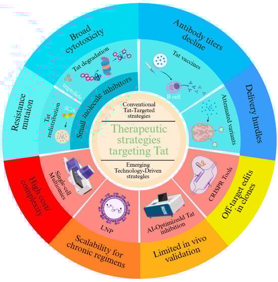 The limitations of conventional approaches have spurred the development of innovative, technology-driven strategies that exploit Tat’s unique biology. Below, we highlight five transformative avenues reshaping Tat-targeted HIV cure research (Figure 2) along with the advantages and challenges of these avenues (Table 4).