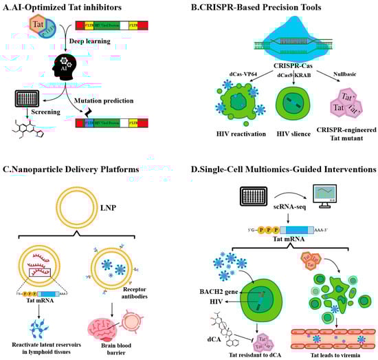 Recently, the remarkable advancements in technology have been reshaping the development of cure strategies specifically targeting Tat, thereby facilitating significant progress toward meaningful breakthroughs. Innovations in nanoparticle delivery systems, machine learning platforms, and paradigm-shifting approaches leverage Tat bistable for silencing (“block and lock”) or activation (“shock and kill” [,,]), effectively repurposing the viral switch against itself.