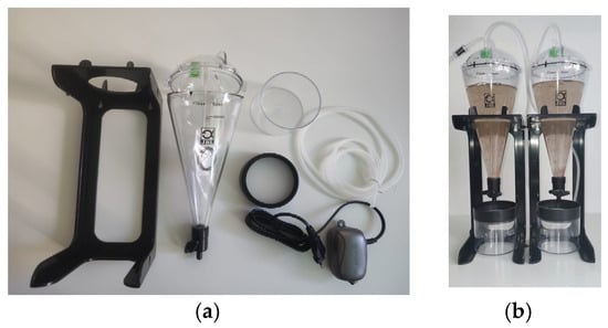 (a). Artemia salina toolkit for incubating Artemia salina eggs, providing controlled environmental conditions crucial for consistent nauplii development. (b). Artemia salina napi developed after 24 h of incubation at 27 °C and a salt concentration of 60 g/L, highlighting successful initial developmental stages.