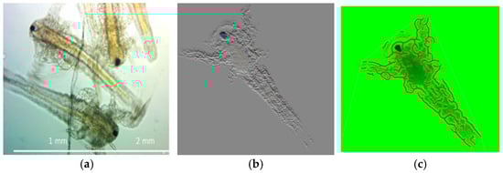 Figure 2 shows (a) raw images of Artemia salina nauplii providing baseline morphological data at ×4 magnification, illustrating typical developmental patterns. (b) shows the preparation of these images for subsequent graph conversion, emphasizing the accuracy needed for analytical assessments. (c) demonstrates the result of converting morphological images into computable graphs used for the quantitative analysis of vascular structures.