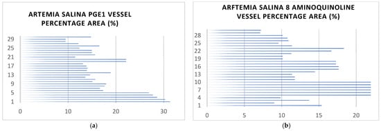 In Figure 3a the vessel percentage area varies across the 30 nauplii. Some individuals exhibit lower coverage, while others have high vessel coverage (approaching 30%). This variation could represent biological heterogeneity in response to vasoprostan stimulation. With regard to the high vessel percentage area (~15–30%), observations at higher vessel percentage areas (e.g., 20–30%) suggest significant vascular network development. This is likely driven by angiogenesis, where vasoprostan stimulates the sprouting and extension of new blood vessels from existing ones, leading to denser vascular networks. Such responses could reflect tissues actively undergoing repair or growth, as angiogenesis is a hallmark of these processes. For moderate vessel coverage (~10–15%), intermediate vessel percentage areas may reflect balanced vascular remodeling. This could represent a combination of angiogenesis and vasculogenesis, where angiogenesis contributes to the refinement of vascular patterns. Vasculogenesis (formation of new vessels de novo) contributes to a broader but less organized network. With regard to low vessel coverage (<10%), observations in this range may indicate a weaker response to vasoprostan, potentially due to early stages of vasculogenesis, where the vascular network is sparse and not yet well-developed. There is variability in individual nauplii’s responsiveness to vasaprostan stimulation. It could also suggest pathological or stressed conditions where proper angiogenic signals fail to materialize. The prostaglandin PGE1 (vasaprostan) enhances blood flow and vascular formation, as shown by the relatively high percentage vessel area in many nauplii. This supports its role as a pro-angiogenic factor. Its impact likely involves the upregulation of vascular endothelial growth factor (VEGF), which stimulates endothelial cell proliferation and migration. High vessel coverage corresponds to enhanced angiogenesis, indicating effective vascular remodeling stimulated by vasaprostan. Low vessel coverage might highlight regions of poor vasculogenic or angiogenic response, possibly due to variability in experimental conditions or inherent biological differences. The graph suggests that vasaprostan plays a dual role in stimulating vasculogenesis (early-stage vessel formation) and angiogenesis (network refinement and expansion). Specific figures relating to the results are as follows: count: 30 (observations) mean (average): 17.4% standard deviation (std): 6.34% minimum: 5.0%25th percentile: 12.25% median (50th percentile): 17.5%75th percentile: 21.75% maximum: 30.0% variance: 40.18% mean. The average vessel coverage is 17.4%, reflecting a moderate response to stimulation by vasaprostan. With regard to the spread, the standard deviation of 6.34% shows moderate variability in vessel coverage between the observed nauplii. In terms of the range, the vessel coverage varies widely, from 5% (minimum) to 30% (maximum), indicating heterogeneity in response to vasaprostan stimulation. The median (17.5%) is close to the mean, suggesting a relatively symmetric distribution of vessel percentage areas. This indicates a robust angiogenic response with noticeable variability among individuals.