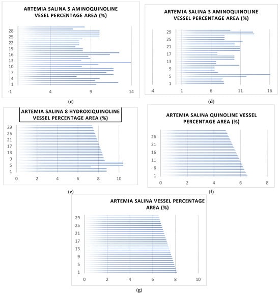 The figure shows Artemia salina nauplii vessel areas after stimulation with optimal concentrations of PGE1, 8-aminoquinoline, 5-aminoquinoline, 3-aminoquinoline, 8-hydroxyquinoline, quinoline, and an unstimulated control. Panels (a–g) show vessel area coverage in Artemia salina nauplii under various treatments. Panel (a), treated with PGE1, exhibited the highest angiogenic response with extensive vessel formation (avg. 17.4%). Panel (b), 8-aminoquinoline, showed moderate stimulation (avg. 9.6%), while panels (c,d), 5- and 3-aminoquinoline, had weaker effects (avg. ~7%). Panels (e,f), 8-hydroxyquinoline and quinoline, displayed strong anti-angiogenic effects with minimal vessel growth (avg. ~6% and 4%, respectively). Panel (g), the unstimulated control, showed baseline coverage (avg. 4.6%). Overall, PGE1 was the most effective inducer of vascular development, while quinoline derivatives ranged from mildly active to strongly inhibitory.