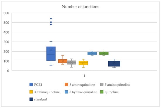 For Artemia salina napi, number of junctions developed after stimulation with 8 aminoquinoline, 5 aminoquinoline, 3 aminoquinoline, 8 hydroxyquinoline, and quinoline compared to the standard unstimulated lot. The bar graph clearly contrasts junction formation among treatments, highlighting the highest junction count with PGE1 stimulation, indicating robust angiogenesis. The descending order of junction counts for quinoline derivatives emphasizes differential inhibitory effects on angiogenesis and vasculogenesis. The three blue dots above the PGE1 box plot represent statistical outliers—individual Artemia salina samples that developed an unusually high number of vascular junctions, exceeding 500. These values fall well beyond the upper quartile range and indicate that, while PGE1 consistently stimulates angiogenesis, some nauplii exhibited an exceptionally strong response. This suggests a degree of biological variability within the group and underscores PGE1’s capacity to induce highly elevated vascular network complexity in certain individuals.
