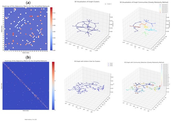 The weighted (distance) adjacency matrix resulted after generating the graphs for Artemia salina napi stimulated with PEG1 (a), and 8-aminoquinoline (b) are represented. The clustering simplified graph and the community graph are also defined to facilitate an analogy regarding the angiogenesis and morphogenesis processes. Weighted adjacency matrices and community graphs illustrate the complexity and connectivity of the vascular networks PGE1 stimulation results in more extensive and interconnected communities, while 8-aminoquinoline shows fewer connections, reflecting partial inhibition.