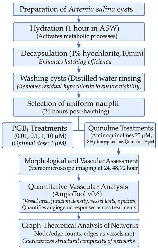 In summary, this study utilizes the Artemia salina model to investigate the angiogenic and vasodilatory effects of quinoline derivatives and prostaglandin E1 (PGE1), providing an efficient, ethical, and informative framework for evaluating therapeutic candidates that enhance vascular growth and circulation.