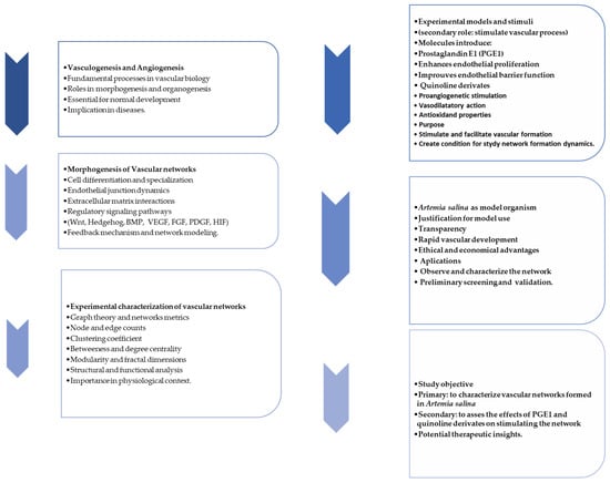 By stimulating living tissues with proper molecules, the angiogenesis and vasculogenesis processes can be observed. Prostaglandin E1 (PGE1), which is a molecule that widens blood vessels and which is used for several medical purposes, such as treating critical limb ischemia, is a typical leading molecule in angiogenesis studies. Nevertheless, its involvement in vasculogenesis and morphogenesis is a more specific subject in the field of developmental biology and therapeutic research. Vasculogenesis is the embryonic phenomenon in which endothelial progenitor cells generate new blood vessels. This phenomenon is distinct and divergent from angiogenesis, which entails the creation of novel blood vessels extending from pre-existing ones. Morphogenesis is the biological phenomenon responsible for the development of an organism or its components into a specific shape. Embryonic development and tissue regeneration are essential components. Current research is investigating the broader consequences of prostaglandins, such as PGE1, in the fields of developmental biology and regenerative medicine. Gaining knowledge about the impact of PGE1 on morphogenesis could provide valuable insights into congenital vascular abnormalities and innovative approaches for tissue repair and regeneration, especially in limb ischemia. In this study, a histologic and morphogenesis study was carried out on Artemia salina napi (first stage of development) by simulating the angiogenesis and morphogenesis processes using PGE1 as the top molecule with vasoactive properties and a series of benopyridyne (3-aminoquinolines, 5-amino quinolines, 8-aminoquinolines, 8-hydroxyquinolines and quinolines, respectively). A series of 30 Artemia salina napi were exposed to the compound listed before. Also, a lot of 30 unexposed Artemia salina napi was taken into account. In total, 210 Artemia salina napi were studied as a model for angionensis and morphogenesis. The study used wet experiments together with imaging reconstruction and graph-generating methodologies. The results show that PGE1 can initiate the shape of the vessel formation. Also, some quinoline series have a pro-mild morphogenetic and angiogenetic effect. Overall, PGE1 plays a significant role in mediating vasculogenesis and morphogenesis through its vasodilatory, anti-inflammatory, and pro-proliferative effects on endothelial cells. PGE1 is involved mainly in increasing the length of the vessel, while the number of vascular branching has an all-simulating general impact. However, the molecules with mild vasculogenic effects tend to develop more complex, limited vascular networks, having a more localized role in the angiogenetic process. Overall imaging and graph analysis showed significant and distinct properties of the vascular network-derived graph.