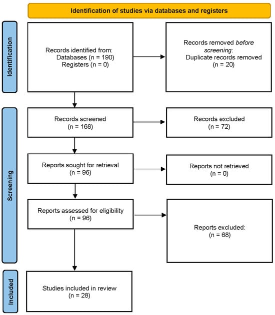 - After deduplication and screening, 28 studies met all criteria and were included in the final synthesis. The study identification and selection process are presented in Figure 1 (PRISMA 2020 flow diagram) [11].
