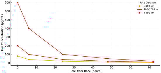 Extreme endurance exercise, such as ultramarathon running, places extraordinary stress on the human body, often leading to a pronounced inflammatory response. Ultramarathons are foot races longer than the standard marathon (42.2 km), encompassing events that range from 50 km mountain trail runs to 24 h races and multiday competitions exceeding 200 km. During and after prolonged exercise, the body releases numerous cytokines and acute-phase proteins as part of the stress and recovery process [1]. Among these, interleukin-6 (IL-6), C-reactive protein (CRP), and tumor necrosis factor-alpha (TNF-α) are key biomarkers commonly used to assess the magnitude and timeline of the inflammatory response.