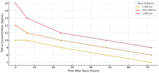 Controlled environment studies confirmed this trend. Gajda et al. [28] reported no increase in TNF-α after a 24-h treadmill ultramarathon, despite elevated IL-6 levels. Fallon [1], analyzing a 6-day track event, found that multiple acute-phase proteins increased while TNF-α did not. These results highlight that TNF-α is not central to the physiological stress response to ultramarathon running and may serve more as a modulated endpoint than a diagnostic signal.
