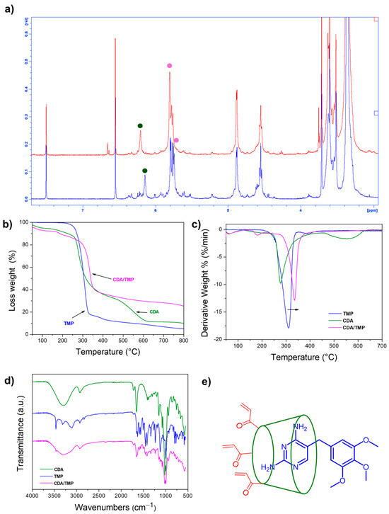 (a) 1H NMR of physical mixture (blue line) and CDA/TMP complex (red line); (b,c) TGA analysis; (d) ATR analysis of CDA and TMP alone and their inclusion complex (CDA/TMP); (e) schematic representation of the TMP region included in cyclodextrin cavity.