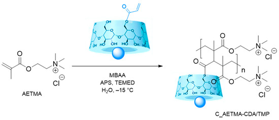 γ-Cyclodextrin, due to its larger cavity size, is particularly suited for complexation with medium-sized molecules such as TMP [12,13]. Additionally, acrylated forms of cyclodextrins facilitate covalent incorporation into polymer matrices, such as hydrogels or cryogels, thereby enabling controlled drug release. Acrylate-based cryogels are widely used in drug delivery due to their tunable mechanical and swelling properties and their ability to incorporate bioactive agents [14,15]. Among the functional monomers employed in cryogel synthesis, [2-(acryloyloxy)ethyl]trimethylammonium chloride (AETMA) plays a distinctive role due to its permanent positive charge conferred by the quaternary ammonium group [16]. This cationic moiety renders the polymer electrostatically active, enabling strong interactions with negatively charged species such as bacterial cell membranes, anionic biomolecules, or contaminants. Moreover, AETMA has been shown to significantly enhance the adhesive properties of cryogels on biological surfaces, including skin, owing to its ability to form strong electrostatic interactions with the negatively charged components of the epidermis [17]. This feature is particularly advantageous for the development of topical drug delivery systems that require intimate and sustained contact with the skin [18].