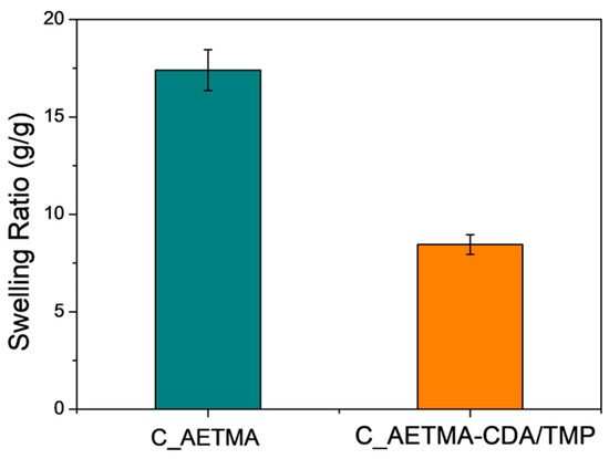 The swelling capacity of the C_AETMA-CDA/TMP was evaluated in phosphate-buffered saline (PBS, pH 7.4) to mimic physiological conditions. After 3 h of equilibration, the cryogel exhibited a swelling ratio of approximately 8.45 g/g, corresponding to an 845% increase in weight (Figure 5). This pronounced water uptake is primarily attributed to the cryogel’s highly interconnected macroporous structure, as well as to the hydrophilic nature of its components. CDA contributes numerous hydroxyl groups capable of forming hydrogen bonds with water, while the quaternary ammonium groups of AETMA facilitate electrostatic interactions with the surrounding medium. In contrast, C_AETMA displayed a significantly higher swelling ratio of 17.4 g/g, highlighting its intrinsic hydrophilicity. These results suggest that CDA contributes not only to drug complexation and stabilization but also to regulating the gel’s fluid absorption properties.