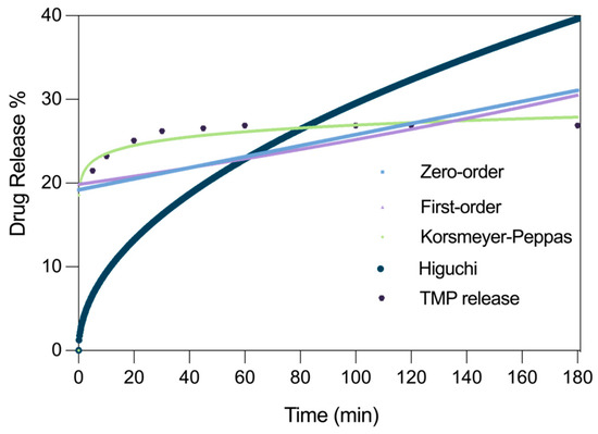 The concentration of released TMP in each aliquot was determined based on a previously established calibration curve (R2 > 0.99), and the cumulative release percentage was calculated accordingly.