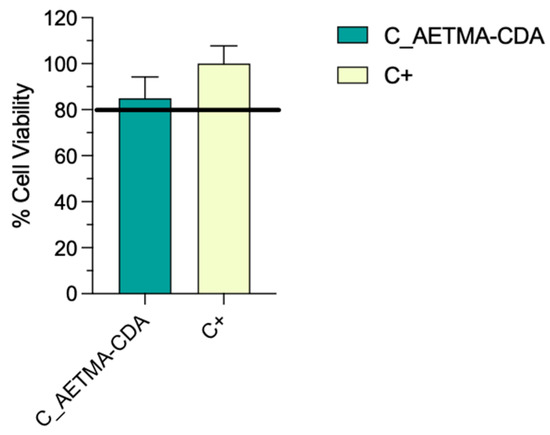 C_AETMA-CDA/TMP did not induce significant cytotoxic effects on HCT-116 cells after 24 h of treatment. As shown in Figure 7, the average cell viability in the treated group was 85%. Since this value exceeded the pre-established cytotoxicity threshold of 80%, the material can be considered non-cytotoxic under the tested conditions. These findings suggested that the disks are biocompatible with HCT-116 cells for 24 h exposure periods. Cell viability consistently remained above the critical cytotoxicity threshold, indicating low adverse effects on cellular metabolism and survival. Further investigations will be necessary to assess long-term exposure, varying concentrations, and the impact on other cell types.