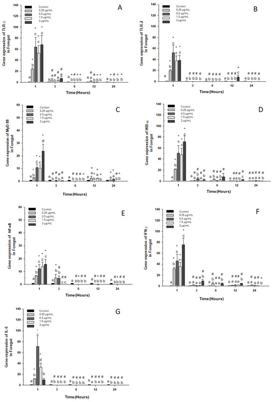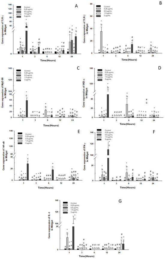 Gene expression in the primary culture of the midgut of O. kisutch treated with oxytetracycline (OTC). (A) TLR-1, (B) TLR-2, (C) MyD88, (D) IκB-α, (E) NF-κb, (F) INF-γ, and (G) IL-6. The relative expression of genes was calculated using the comparative Ct method (2−ΔΔCT), with the 18S ribosomal protein as the internal reference gene. Each value represents the mean ± S.E.M. Different letters (a,b,c) indicate statistical differences at the same time point and between treatments. Symbols (*, #, +) over the bars indicate statistical differences of treatments (control and different doses of antibiotic) at different time points. Two-way ANOVA followed by Tukey’s test (p < 0.05).
