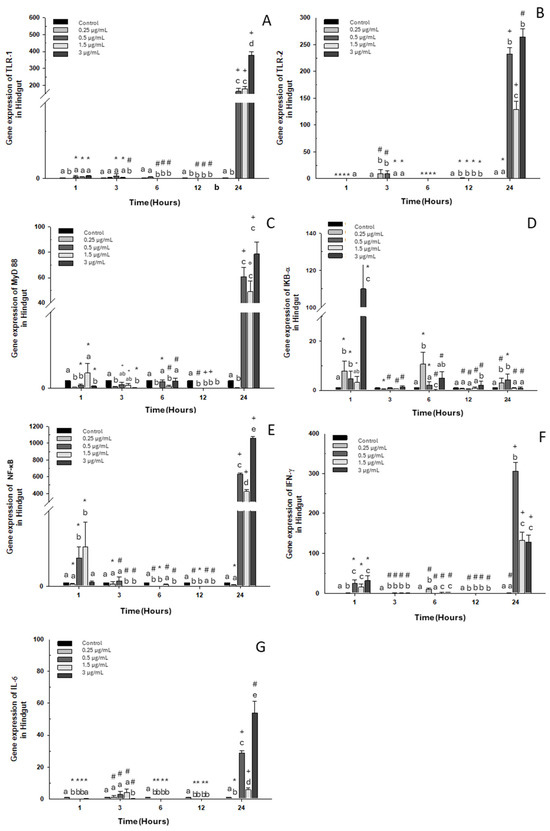 Gene expression in the primary culture of the hindgut of O. kisutch treated with oxytetracycline (OTC). (A) TLR-1, (B) TLR-2, (C) MyD88, (D) IκB-α, (E) NF-κb, (F) INF-γ, and (G) IL-6. The relative expression of genes was calculated using the comparative Ct method (2−ΔΔCT), with the 18S ribosomal protein as the internal reference gene. Each value represents the mean ± S.E.M. Different letters (a–e) indicate statistical differences at the same time point and between treatments. Symbols (*, #, +) over the bars indicate statistical differences of treatments (control and different doses of antibiotic) at different time points. Two-way ANOVA followed by Tukey’s test (p < 0.05).