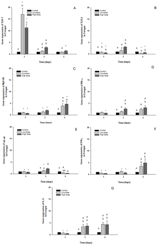 TLR-1, TLR-2, MyD88, IKB-α, NFK-β, and IL-6 gene expression presented a similar pattern to the control group. At the same time, IFN-γ on day 5 showed a significant “3- to 5-fold” increase in fish exposed to low and high doses compared to the control group (Figure 5A–F).