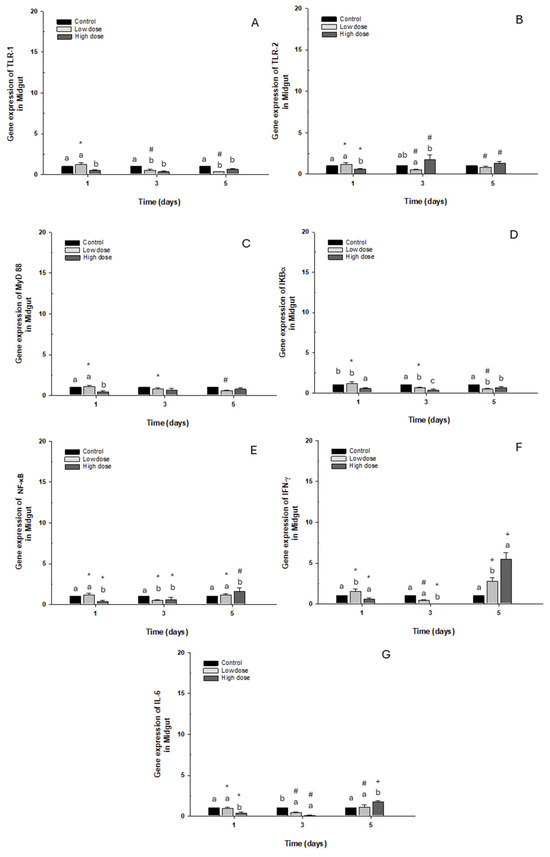 Gene expression in vivo of the midgut of O. kisutch treated with oxytetracycline (OTC). (A) TLR-1, (B) TLR-2, (C) MyD88, (D) IκB-α, (E) NF-κb, (F) INF-γ, and (G) IL-6. The relative expression of genes was calculated using the comparative Ct method (2−ΔΔCT), with the 18S ribosomal protein as the internal reference gene. Each value represents the mean ± S.E.M. Different letters (a,b,c) indicate statistical differences at the same time point and between treatments. Symbols (*, #, +) over the bars indicate statistical differences of treatments (control and different doses of antibiotic) at different time points. Two-way ANOVA followed by Tukey’s test (p < 0.05).