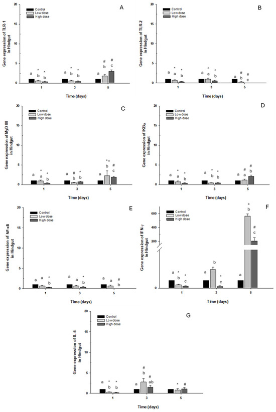Gene expression in vivo of the hindgut of O. kisutch treated with oxytetracycline (OTC). (A) TLR-1, (B) TLR-2, (C) MyD88, (D) IκB-α, (E) NF-κb, (F) INF-γ, and (G) IL-6. The relative expression of genes was calculated using the comparative Ct method (2−ΔΔCT), with the 18S ribosomal protein as the internal reference gene. Each value represents the mean ± S.E.M. Different letters (a,b,c) indicate statistical differences at the same time point and between treatments. Symbols (*, #, +) over the bars indicate statistical differences of treatments (control and different doses of antibiotic) at different time points. Two-way ANOVA followed by Tukey’s test (p < 0.05).