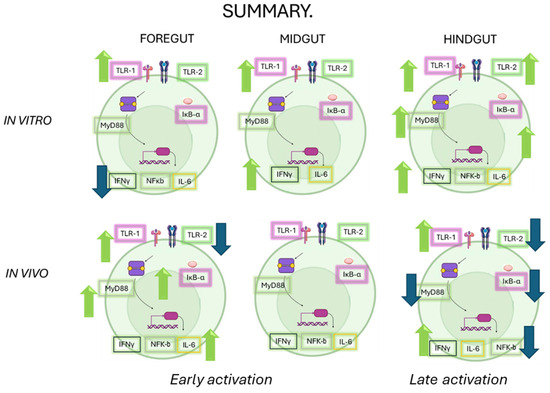 A summary of all of the responses evaluated in this work under both approaches (in vitro and in vivo). The green arrows correspond to an increase and the blue arrows correspond to a decrease in the transcripts of the immunological markers.